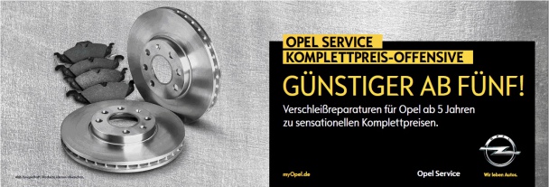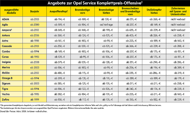 1 Die Opel Tiefpreisgarantie gilt nur bei Montage durch uns am Fahrzeug und nur bei Verwendung von Opel Original Teilen. Voraussetzung ist die Vorlage eines schriftlichen Wettbewerbsangebots: gesondert ausgewiesene Kalkulation von Opel Original Teilen und Lohn, nicht älter als 14 Tage, Standort des Wettbewerbers innerhalb der BRD und innerhalb eines 30-km-Radius zu uns.